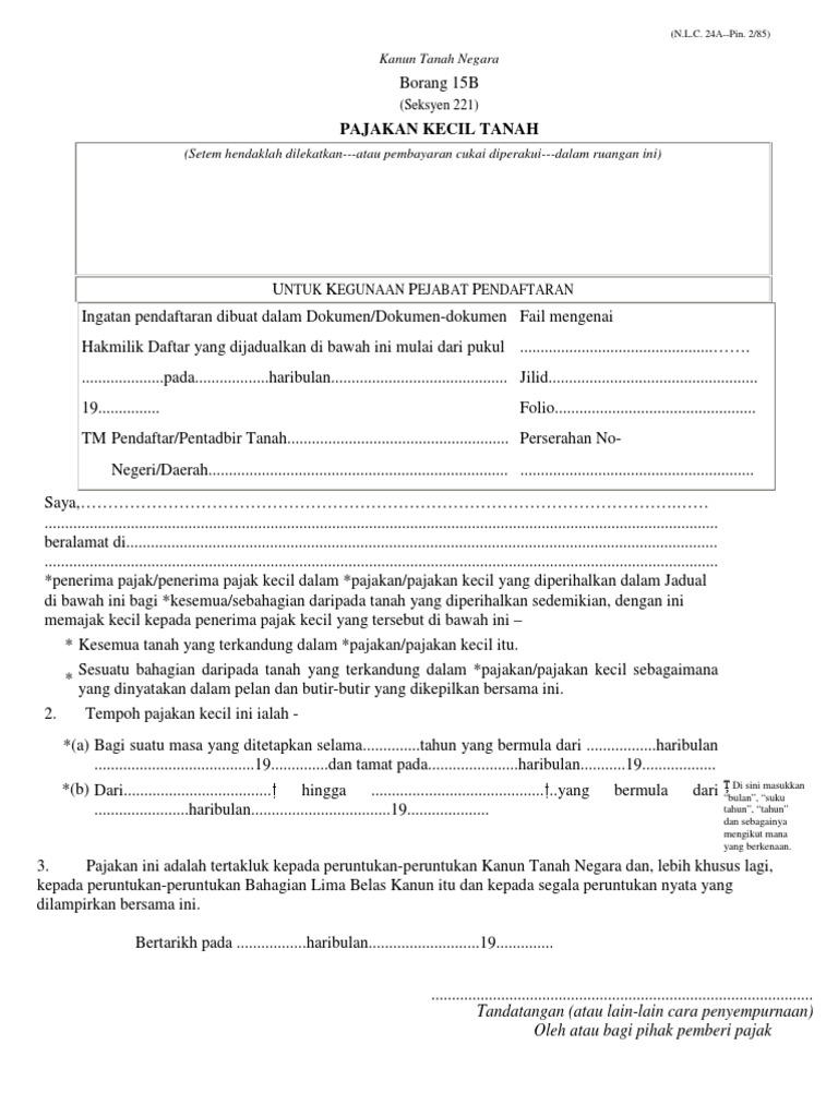 Borang pajakan tanah. Setiap urusan yang hendak dijalankan di unit ini mestilah menggunakan suratcara iaitu dengan menggunakan borang borang yang tertentu bergantung kepada jenis urusan yang hendak dilakukan. Mendapatkan kebenaran jalan laluan permohonan mendapatkan jalan laluan pdf 9. Borang tuntutan elaun perjalanan dalam negeri. Borang 15a seksyen 221 pajakan tanah untuk menjamin pembayaran wang pokok setem hendaklah dilekatkan atau pembayaran cukai diperakui dalam ruangan ini untuk kegunaan pejabat pendaftaran ingatan pendaftaran dibuat dalam dokumen dokumen dokumen fail mengenai.