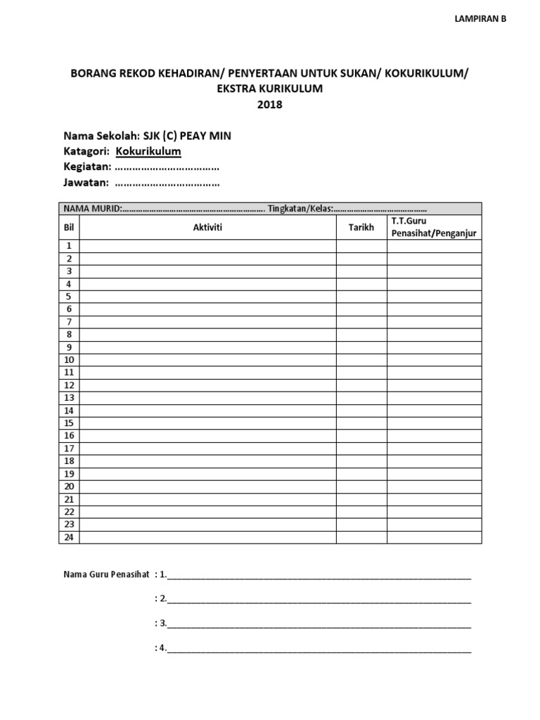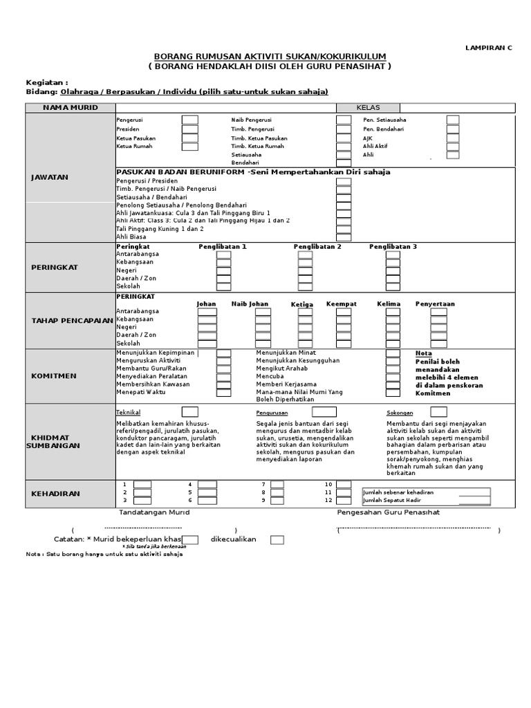 Borang rumusan aktiviti sukan kokurikulum ada 3 aspek permarkahan iaitu penglibatan 50 m penyertaan 40m dan prestasi 20 dari setiap aspek tersebut pula dibahagikan kepada elemen elemen yang pelajar capai. Dokumen opsyen pertukaran pelantikan. Manual baru pajsk bahan taklimat pajsk tahun 4 instrumen d tahun 4 panduan segak spi 4 2008 panduan segak dasar kokurikulum pengiktirafan markah ko pengurusan pajsk. Borang rumusan aktiviti sukan i kokurikulum borang hendaklah diisi oleh guru penasihat kegiatan.