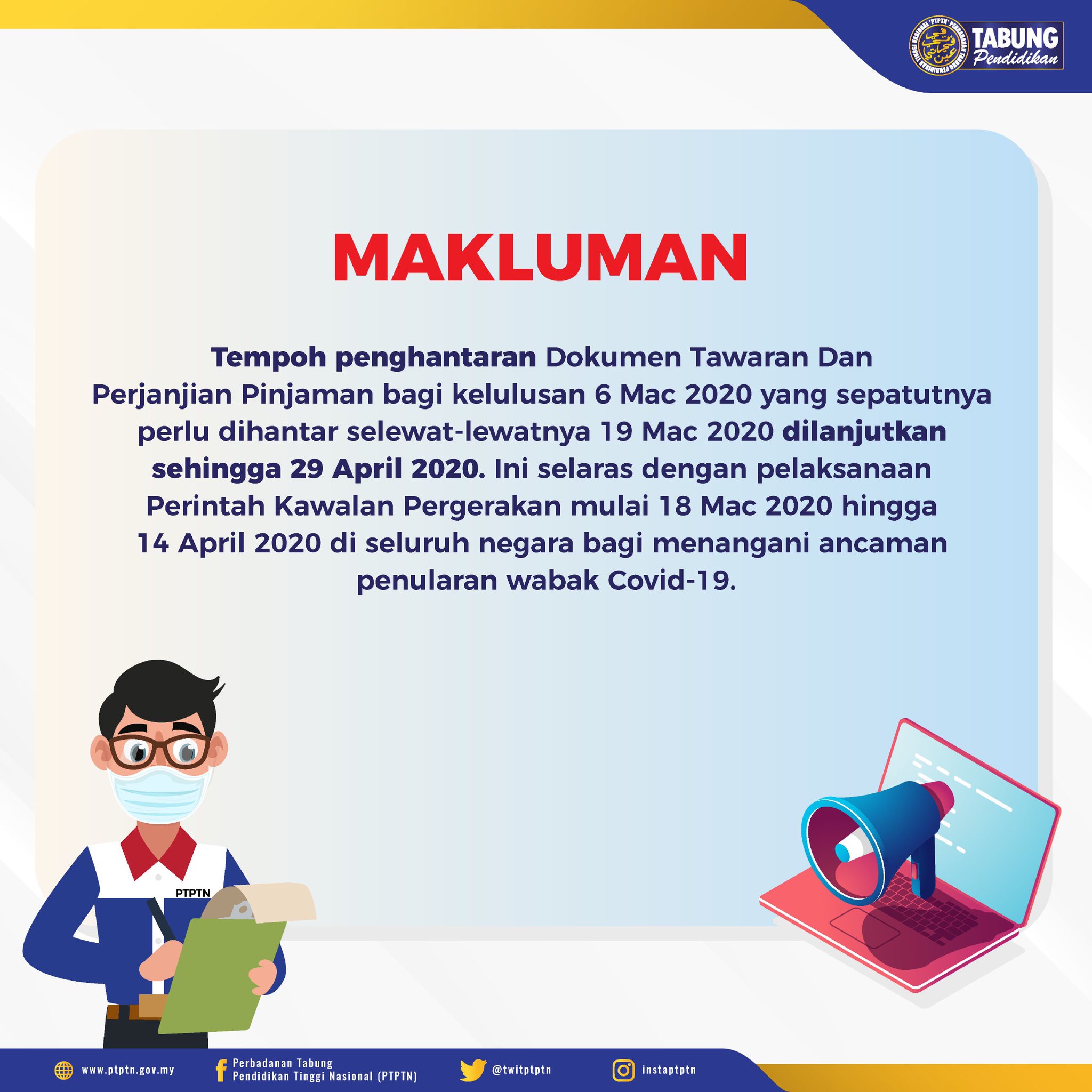 Borang pengesahan pemilihan bank pembayar bagi pengeluaran pinjaman pendidikan ptptn. Borang permohonan pelanjutan tempoh pembiayaan pendidikan ptptn. Pelanjutan tempoh penghantaran dokumen tawaran dan perjanjiian pinjaman ptptn berikutan dengan pengumuman pelaksanaan perintah kawalan pergerakan pkp fasa 5 mulai 13 mei 2020 sehingga 9 jun 2020 di seluruh negara bagi menangani ancaman penularan wabak covid 19 ptptn telah bersetuju supaya tempoh penghantaran dokumen tawaran dan perjanjian pinjaman bagi kelulusan 6 mac 2020 7 april 2020 dan. Pelanjutan tempoh penghantaran dokumen tawaran dan perjanjiian pinjaman ptptn berikutan pelaksanaan perintah kawalan pergerakan pkp fasa 3 mulai 15 april 2020 hingga 28 april 2020 di seluruh negara bagi menangani ancaman penularan wabak covid 19 ptptn telah bersetuju supaya tempoh penghantaran dokumen tawaran dan perjanjian pinjaman bagi kelulusan 6 mac 2020 dan 7 april 2020 dilanjutkan.