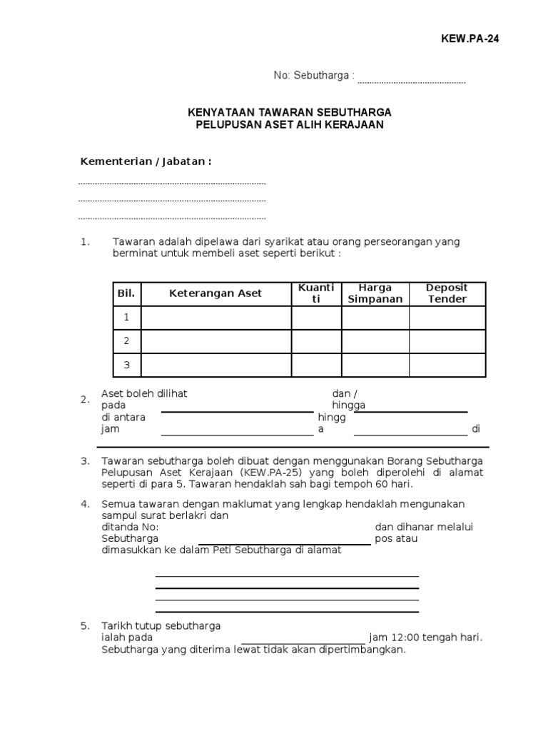 Tawaran sebut harga boleh dibuat dengan menggunakan borang sebut harga pelupusan aset alih kerajaan kew pa 28 yang boleh diperoleh di alamat seperti di para 4. Semua tawaran dengan maklumat yang lengkap hendaklah menggunakan. Kew 1 pa 22 borang tender pelupusan as. Kew 1 pa 19 sijil pelupusan aset alih microsoft word document 23 5 kb.