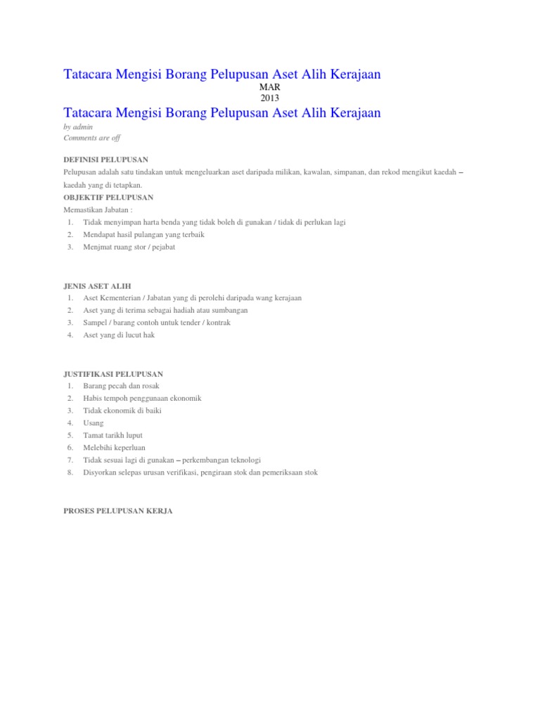 Borang pelupusan aset tak alih. Bagi aset yang tidak boleh digunapakai lagi atau berstatus kerosakan kekal sememangnya perlu dilupuskan melalui tindakan pelupusan iaitu mengikut tatacara yang ditetapkan. Folder pelupusan aset alih kerajaan dan had perwakilan kuasa di bawah seksyen 5 akta perwakilan kuasa p u b 485 1956 berkenaan had kuasa melulus pelupusan bagi semua jabatan agensi di bawah kpm. Aset awam adalah semua aset termasuk aset tak alih serta barang barang awam yang mempunyai pengertian yang diberi kepadanya di bawah seksyen 3 akta acara kewangan 1957 akta 61 yang dibeli disewa beli atau. Pelupusan aset tak alih kerajaan laporan pemeriksaan dan penarafan aset tak alih bab e penilaian keadaan prestasi aset.