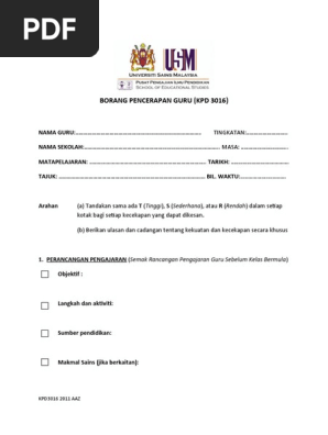 Borang pencerapan guru 2018. Ketua polis daerah timur laut komisioner soffian santong berkata guru berkenaan ditemui meninggal dunia kira kira jam 10 35 pagi dalam keadaan terbaring dalam kereta jenis proton saga. Jadual pencerapan pembelajaran dan pengajaran guru kali pertama 2019 bulan nama guru dan pencerap gb. Guru guru boleh melihat dan memuat turun borang borang skpmg2 excell autokira dan pdf skpmg2 pada pautan di bawah. Berikut adalah borang standard 4 iaitu intrumens penilaian bagi pdpc guru.