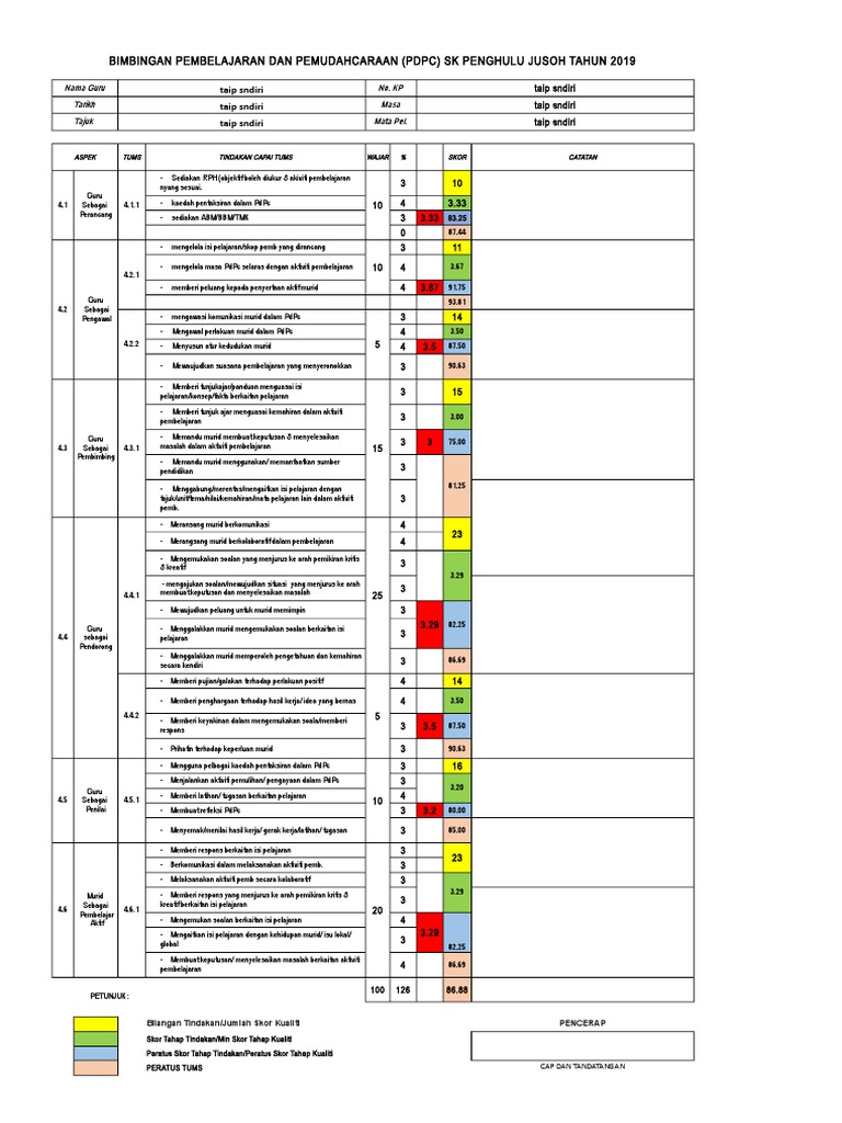 Borang pencerapan pdpc guru. Dalam standard 4 ini terdapat penilaian terhadap guru iaitu penilaian pdpc untuk guru. Borang pengskoran pdpc standard 4 berikut adalah borang skor bagi pencerapan pdpc yang akan dibuat oleh guru sendiri dan pentadbir sekolah. Pembelajaran dan pemudahcaraan di dalam skpmg2 guru berperanan sebagai pemudah cara dalam pembelajaran dan pengajaran pdp yang berkesan untuk memperkembangkan potensi murid secara menyeluruh dan pencapaian murid pada tahap optimum secara berterusan. Guru sebagai pengawal aspek 4 3.