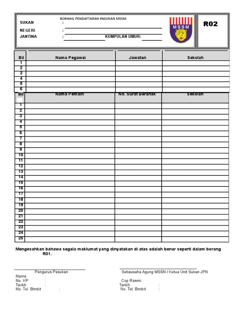7 1 1 setiap pemain mesti mendaftar dalam borang pendaftaran pemain r01 r02 e kejohanan dan r03 bagi bawah 12 tahun dan m02 dan m03 bagi bawah 15 tahun dan 18 tahun. Diakui penama di atas adalah ahli pasukan ini yang menyertai kejohanan pertandingan majlis sukan sekolah sekolah malaysia dan sepanjang pengetahuan saya semua maklumat yang diberikan. Borang pendaftaran pasukan mssm permainan sukan. Borang pendaftaran m01 m02 r01 dan r02 untuk guru.