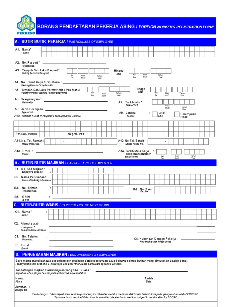 Saya mengesahkan bahawa tiada seorang pun pekerja perusahaan ini sebagaimana yang ditakrifkan dalam seksyen 2 5 akta telah tertinggal daripada senarai di atas. Socso borang pendaftaran pekerja asing. Tandatangan tidak diperlukan sekiranya borang ini dihantar melalui medium elektronik tertakluk kepada pengesahan oleh perkeso. This page is also available in.