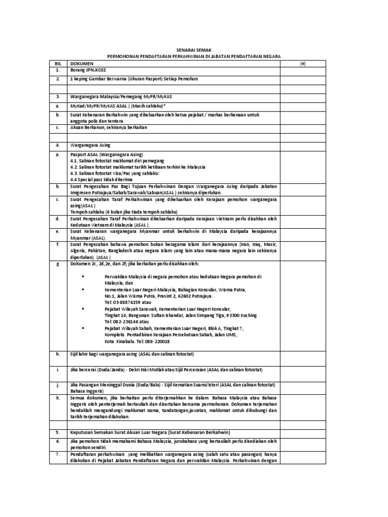 Memberi khidmat nasihat serta panduan kepada orang ramai berkaitan persoalan hukum dan prosedur perkahwinan pendaftaran perceraian dan ruju di wilayah persekutuan. Borang pemohon perempuan yang telah disahkan oleh penolong pendaftar perkahwinan jurunikah kariah di kariah beserta dokumen yang diperlukan dan kebenaran berkahwin daripada pihak lelaki hendaklah dikemukakan ke bahagian perkahwinan dan pembangunan keluarga jawi. Anda dan pasangan perlu membuat akuan berkanun di bahagian d 2 dalam borang jpn kc02 di hadapan seorang pesuruhjaya sumpah ataupun majistret di mahkamah. C hakcipta terpelihara 2016 jabatan pendaftaran negara malaysia paparan terbaik menggunakan mozilla firefox google chrome internet explorer 9 0 ke atas dengan resolusi 1024 768 kemaskini terakhir.