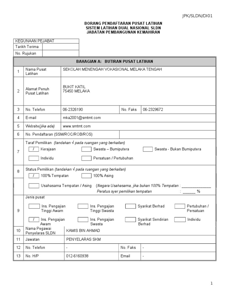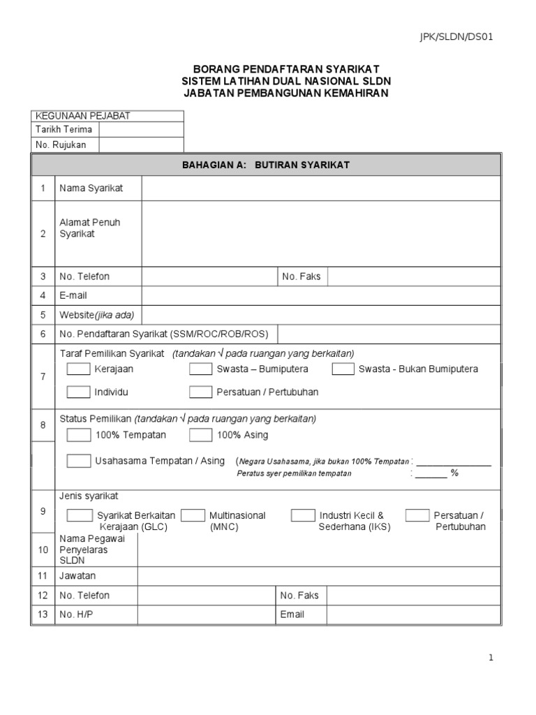 Jpk sldn ds01 1 borang pendaftaran syarikat sistem latihan dual nasional sldn jabatan pembangunan kemahiran kegunaan pejabat tarikh terima no. Jenis perniagaan syarikat perunding. Kelayakan membaca menulis dan mengira. Pendaftaran pendaftaran pelatih adalah sebanyak 5 kali dalam setahun iaitu pada bulan januari mac mei dan september.