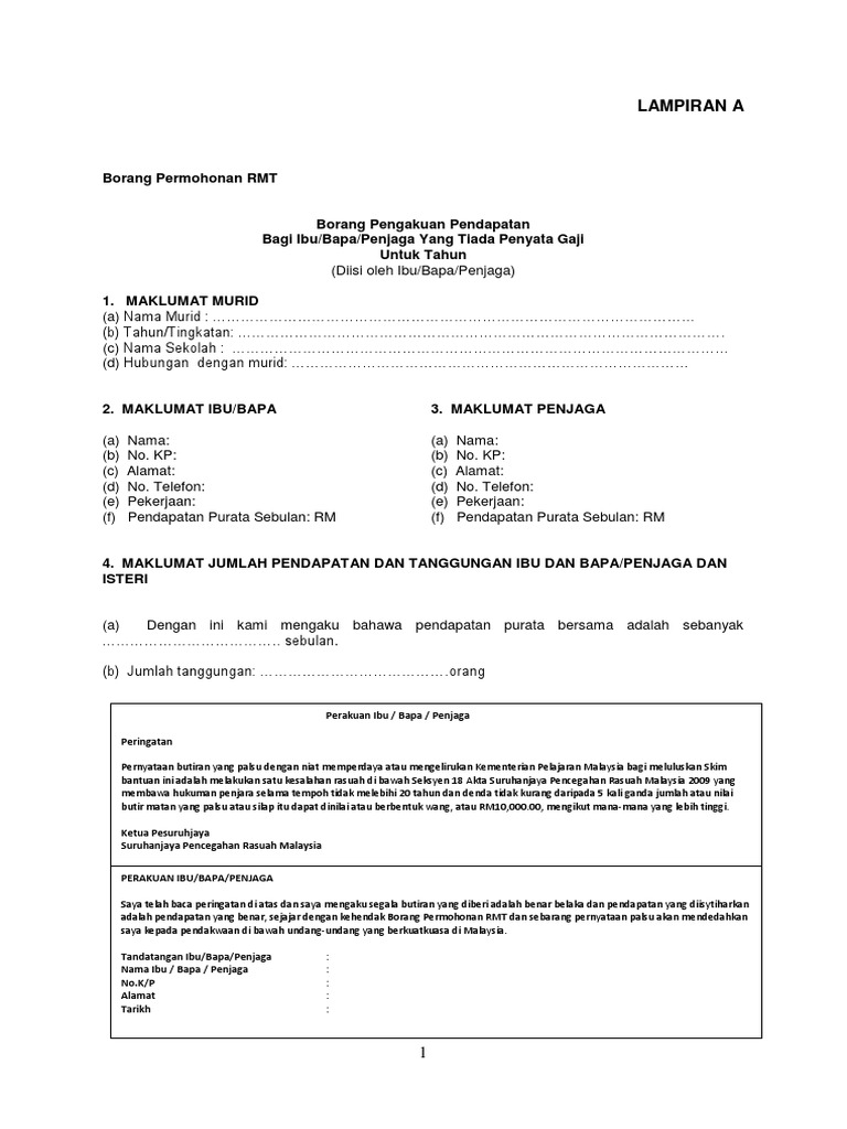 Borang ini hanya perlu diisi oleh ibu bapa penjaga yang tiada slip pendapatan atau borang j penyata cukai pendapatan a. Ketua kampung dan yang setaraf dengannya berdasarkan pengakuan pendapatan yang disertakan bersama. C nama sekolah. Borang maklumat murid untuk sekolah di malaysia.