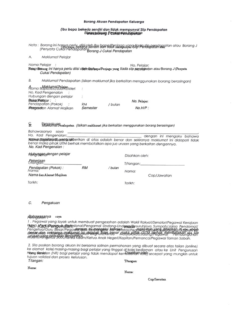 Borang akuan pendapatan keluarga ibu bapa bekerja sendiri dan tidak mempunyai slip pendapatan atau borang j cukai pendapatan nota.