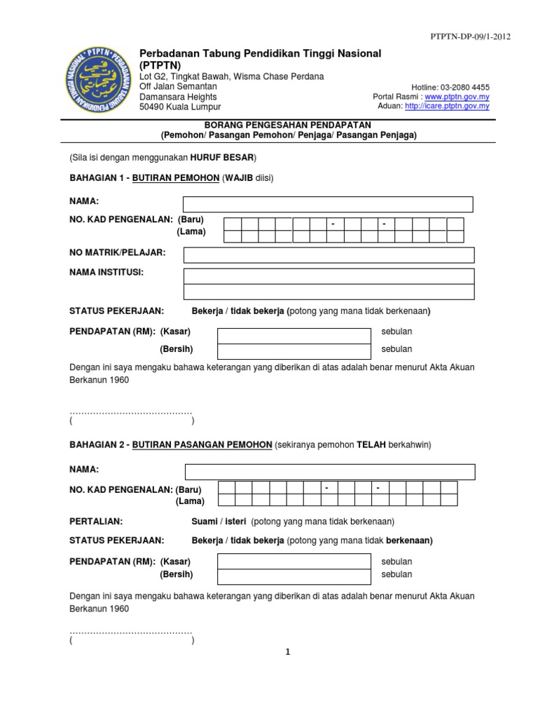 Simpan simpan borang pengesahan pendapatan ptptn untuk nanti. 14 salinan slip gaji terkini borang tafsiran cukai pendapatan be terkini penyata pencen pengesahan pendapatan ibu bapa penjaga jika bekerja sendiri 15 salinan surat pengesahan masih belajar dari ipt bagi peminjam yang memohon pada semester kedua dan ke atas 16 salinan keputusan peperiksaan setiap semester. Perbadanan tabung pendidikan tinggi nasional tingkat bawah menara ptptn blok d megan avenue ii no 12 jalan yap kwan seng 50450 kuala lumpur. Borang ini perlu diserahkan bersama sama.