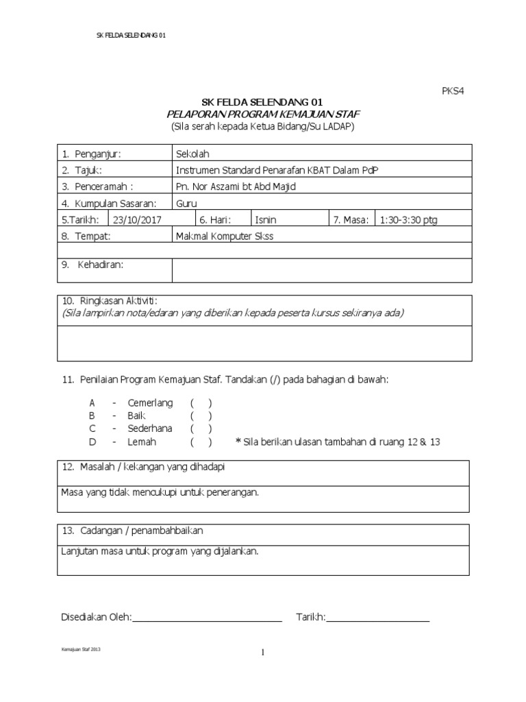 Rekodkan kursus yang telah dihadiri dalam splg esspel on line. 01 pengetahuan profesional 02 kemahiran profesional 03. Sediakan borang spsk pk10 4 instrumen penilaian kursus latihan dan borang spsk 10 5 instrumen keberkesanan program secukupkan untuk dilengkapkan oleh semua peserta. Blog ini adalah blog peribadi.