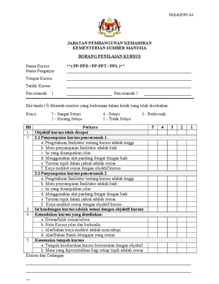 Borang penilaian penceramah kursus. Idb dbkl gov my kursus bengkel transformasi negara 1. Secara keseluruhan bagaimana anda menilai modul ini. 22 disember 2011 oleh. Borang ul 02 dikemaskini.