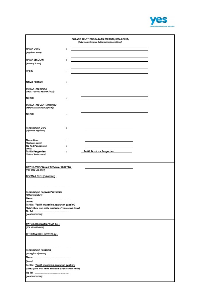 Klik untuk muat turun boang info penggunaan peranti yes 4g. Borang delivery note dilampirkan 2. Guru membuat akuan penerimaan peranti dan pelan data 2gb secara individu. Borang penyelenggaraan peranti borang pemulangan peranti borang permohonan pelan data guru baharu dan juga borang maklumat guru perpindah.