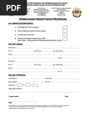 Borang permohonan cerai wilayah persekutuan. Mengurus perlantikan ketua pendaftar pendaftar kanan pendaftar dan penolong pendaftar nikah cerai dan ruju orang islam. Bagi kes pengesahan lafaz cerai pula borang seksyen 57 diperlukan muat turun borang seksyen 57. Pemohon hadir ke paid dengan mengemukakan borang dan dokumen seperti berikut. Lengkapkan saman permohonan seksyen 47 4 salinan muat turun borang seksyen 47 beserta salinan kad pengenalan dan sijil nikah sijil rujuk.