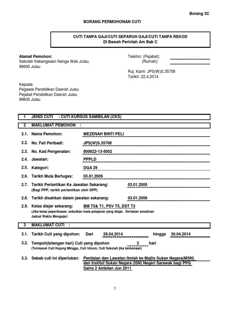Home kemudahan cuti kursus sambilan cks kepada pegawai yang mengikuti pengajian secara sambilan di institusi pengajian tinggi ipt dalam negara kategori. Cuti tanpa gaji dan separuh gaji borang permohonan cuti tanpa gaji dan separuh gaji di bawah perintah am bab c lampiran a 6. Pekeliling kemudahan tambang mengunjungi wilayah asal bagi pegawai yang bertukar wilayah. Cuti kuarantin borang permohonan kemudahan cuti kuarantin pekeliling perkhidmatan bilangan 11 tahun 2016 mengenai cuti kuarantin.