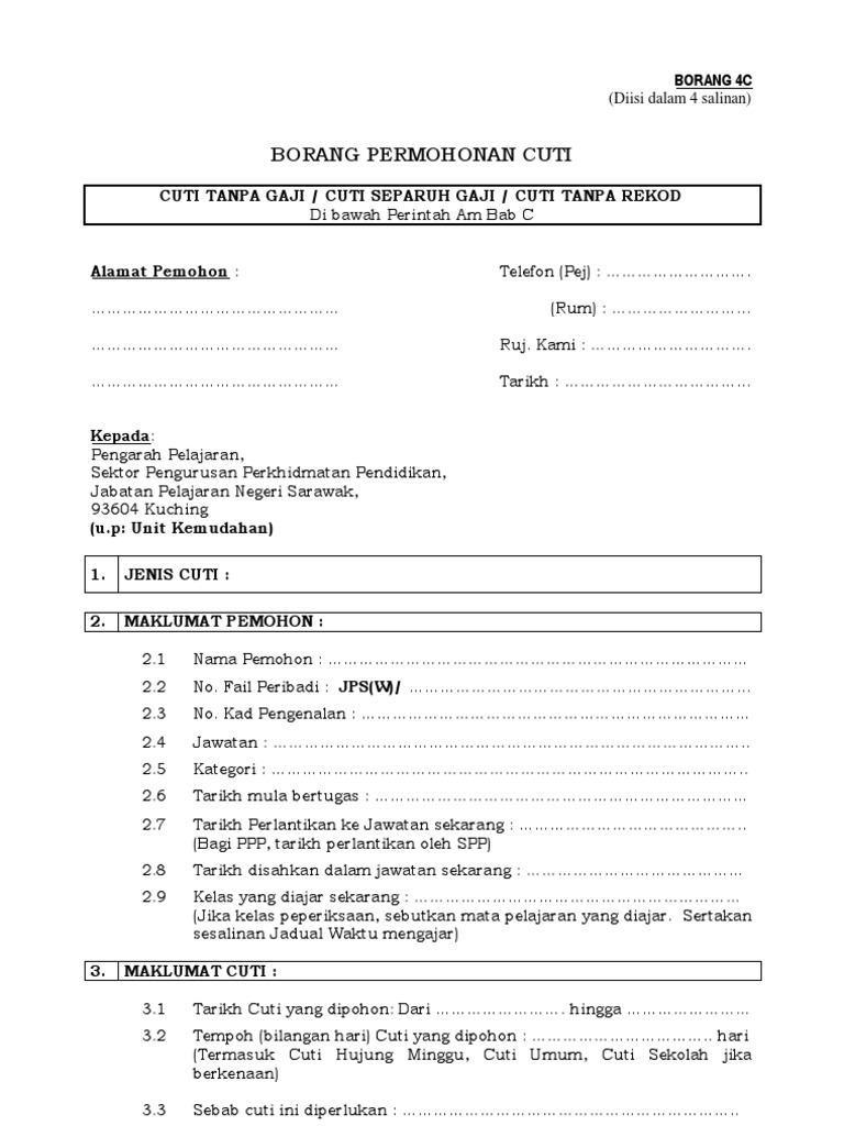 Borang permohonan cuti separuh gaji kkm. Kesan ke atas perkhidmatan seseorang pegawai berbeza mengikut cuti yang diluluskan. Tidak menjejaskan kelayakan pegawai bagi kemudahan cuti separuh gaji di bawah peruntukan perintah am 13 dan perintah am 51 bab c cuti tahun 1974 serta cuti tanpa gaji di bawah peruntukan perintah am 14 dan perintah am 52 bab c cuti tahun 1974. Bagi maksud surat pekeliling perkhidmatan ini senarai cuti bergaji penuh cuti separuh gaji dan cuti tanpa gaji yang sedang berkuat kuasa bagi pegawai lantikan tetap adalah seperti di lampiran b. Borang 3c borang permohonan cuti cuti tanpa gaji cuti separuh gajucuti tanpa rekod di bawah perintah am bab c.