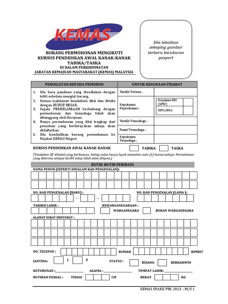 Pastikan calon mengisi borang permohonan guru tabika taska kemas spakk pin 2013 seperti yang dimuat turun. Syarat permohonan kursus spakk 2019. Return to permohonan guru tabika kemas 2020 secara online di buka borang permohonan kemas spakk. Taman asuhan kanak kanak taska borang.
