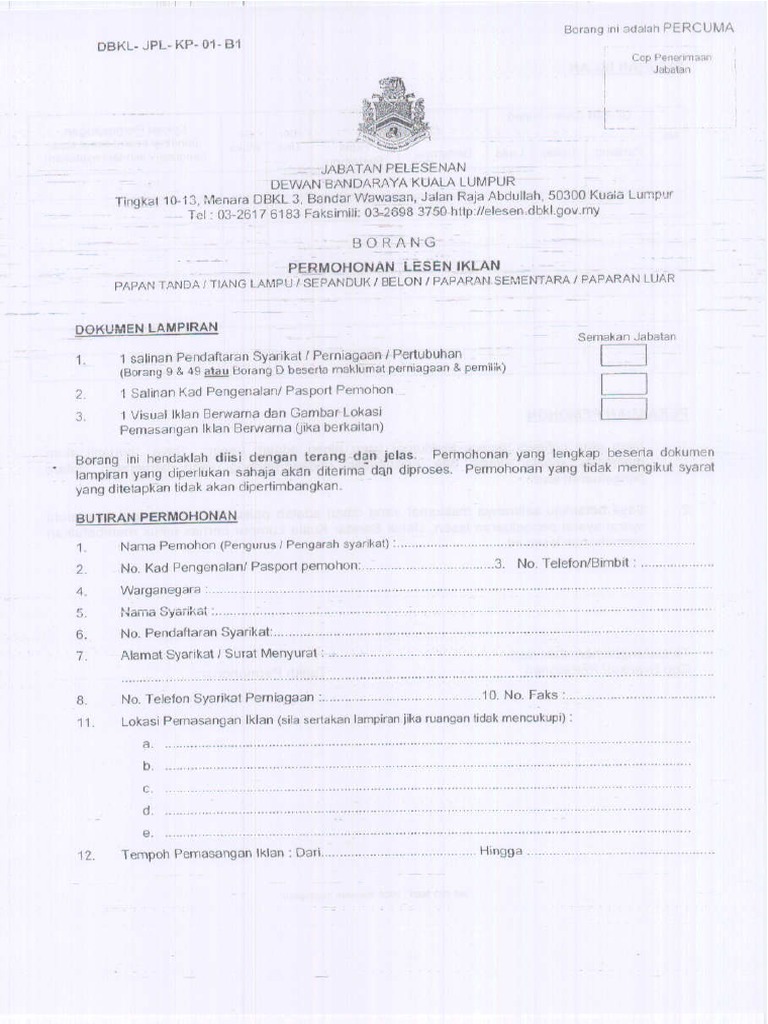 Borang permohonan lesen perniagaan kuala lumpur. Kaunter pertanyaan aras 4 mpaj. 1 salinan pendaftaran syarikat perniagaan pertubuhan borang 9 49 atau borang d beserta maklumat perniagaan pemilik 2. Dewan bandaraya kuala lumpur tingkat 4 5 9 menara dbkl 2 jalan raja laut 50350 kuala lumpur tel. Tingkat 5 menara dbkl 2 jalan raja laut.