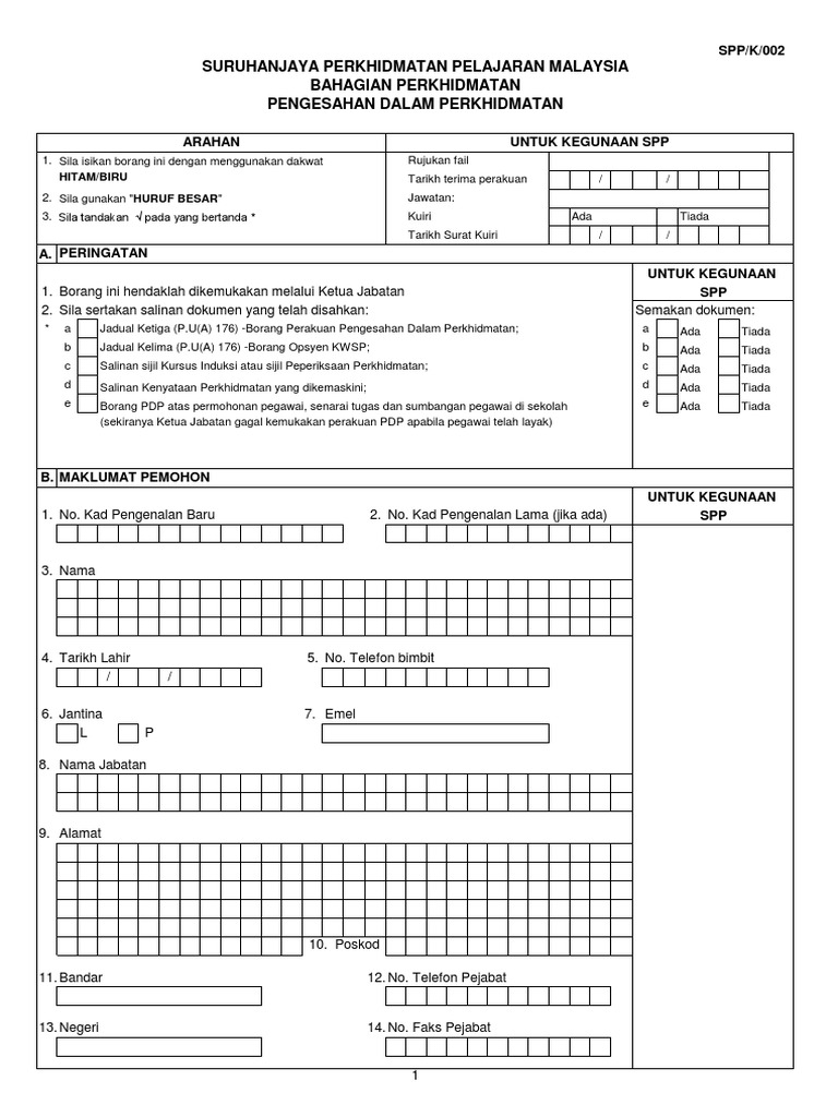 Borang permohonan pdp pegawai spp k 002. Peranan tanggungjawab borang spp k 002 jadual ketiga kelima tidak. Syarat pengesahan dalam perkhidmatan bagi pegawai perkhidmatan pendidikan borang permohonan pdp pegawai spp k 002 borang spp k 002 pengesahan dalam perkhidmatan. Ketua jabatan hendaklah memperaku pdp pegawai dalam tempoh satu 1 bulan dari tarikh pegawai itu didapati layak bagi pengesahan dengan mengemukakan dokumen seperti berikut. Borang permohonan pdp pegawai spp k 002 lampiran i pekeliling spp bil.