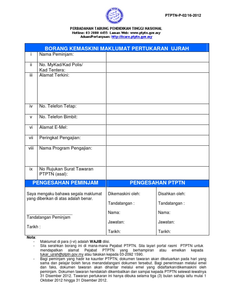 Borang yang telah dilengkapkan hendaklah dikemukakan kepada pejabat ptptn negeri cawangan ppn ppc yang berhampiran. 04 928 4 85 4088. Untuk makluman peminjam penawaran ujrah adalah terbuka kepada semua peminjam konvensional kecuali penerima wpp bukan peminjam. Peminjam akan diberikan 2 set dokumen tawaran ujrah.