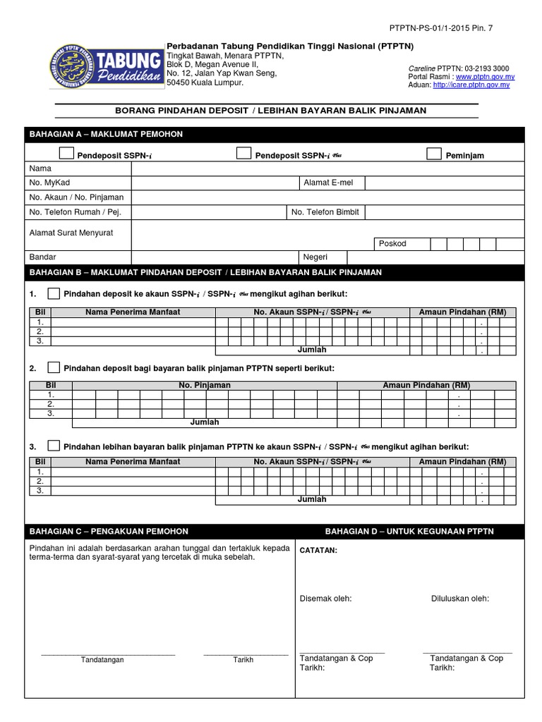 Borang pindahan deposit lebihan bayaran balik pinjaman. 4 2 akaun hendaklah berbaki rm1 000 00 selepas pengeluaran. Borang semakan penamaan sspn oleh waris.