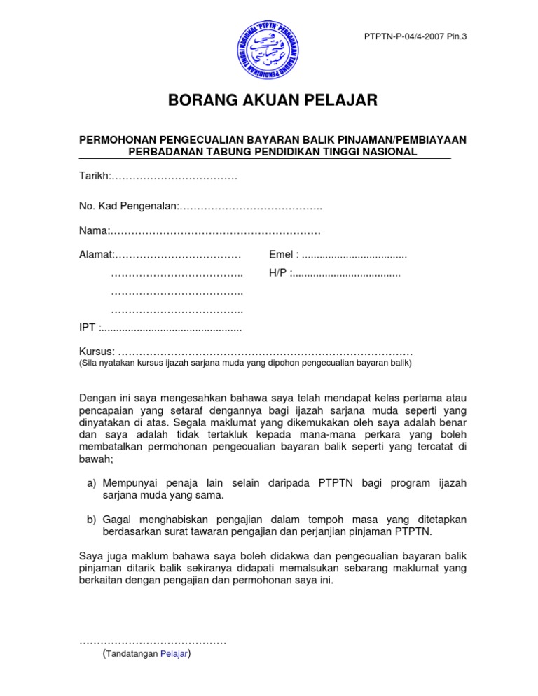 Borang ptptn kelas pertama. Untuk makluman permohonan pengecualian bayaran balik ptptn untuk peminjam ijazah sarjana muda kelas pertama kini di buka. Penerima biaya perlu membuat bayaran balik sepertimana yang ditetapkan sehingga permohonan pengecualian bayaran balik diluluskan. Manual pengguna 1 perkara muka surat manual pengguna sistem permohonan pengecualian bayaran balik pinjaman ijazah sarjana muda kelas. Sila hubungi careline ptptn ditalian 03 2193 3000 bagi mendapatkan no.