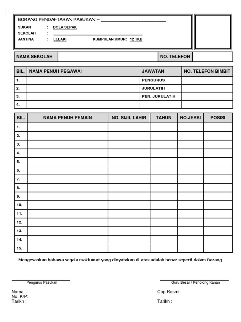 Maklumat tentang sekolah rendah. Borang r02 borang pendaftaran pasukan download borang 1. R01 nama pemain. Diakui penama di atas adalah ahli pasukan ini yang menyertai kejohanan pertandingan majlis sukan sekolah sekolah malaysia dan sepanjang pengetahuan saya semua maklumat yang diberi adalah benar.