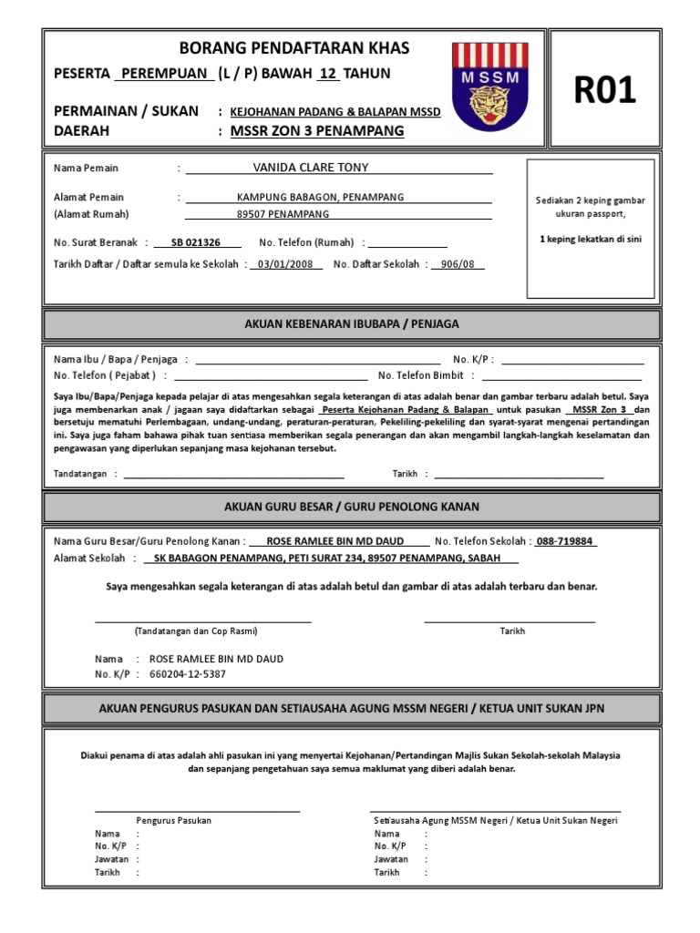 Borang r01 borang pendaftaran pemain panduan mengisi borang r01 dan mo1 1. R01 nama pemain. Maklumat atlet pastikan bahagian bahagian di bawah. Borang r01 dan borang r02.