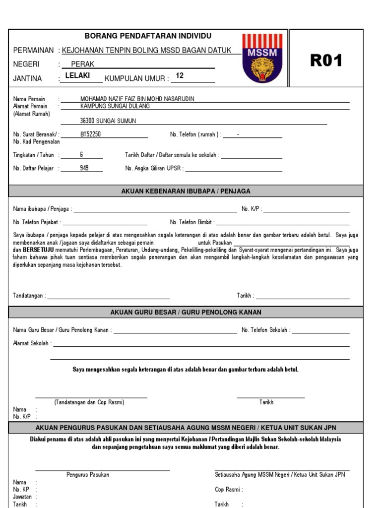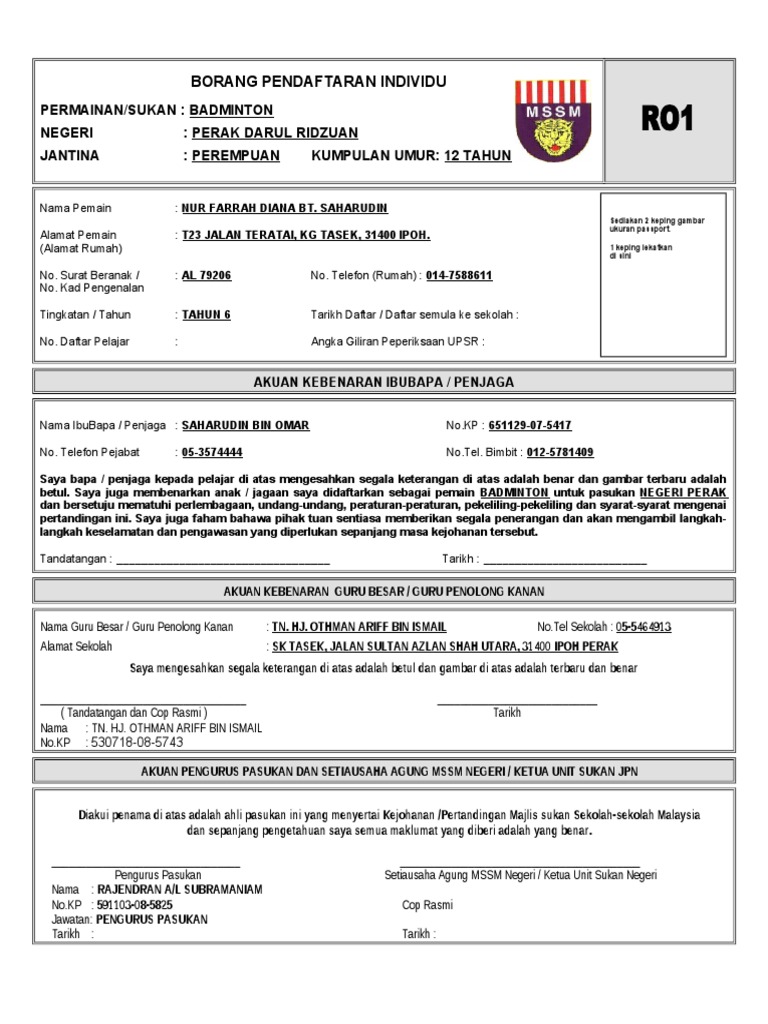 Save save borang pdaftaran r01 mss perak 2018 1 for later 0 0 upvotes mark this document as useful 0 0 downvotes mark this document as not useful embed share. Borang r01 pendaftaran pemain mssm borang pendaftaran pemain r01. Alamat pemain. Alamat rumah.