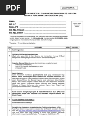 Senarai semak dokumen temu duga author. Suruhanjaya perkhidmatan pelajaran malaysia. Bagi calon yang lahir di luar negara kemukakan borang w surat pengesahan kewarganegaraan dari jabatan pendaftaran negara 3. Senarai tugas dan ko kurikulum.