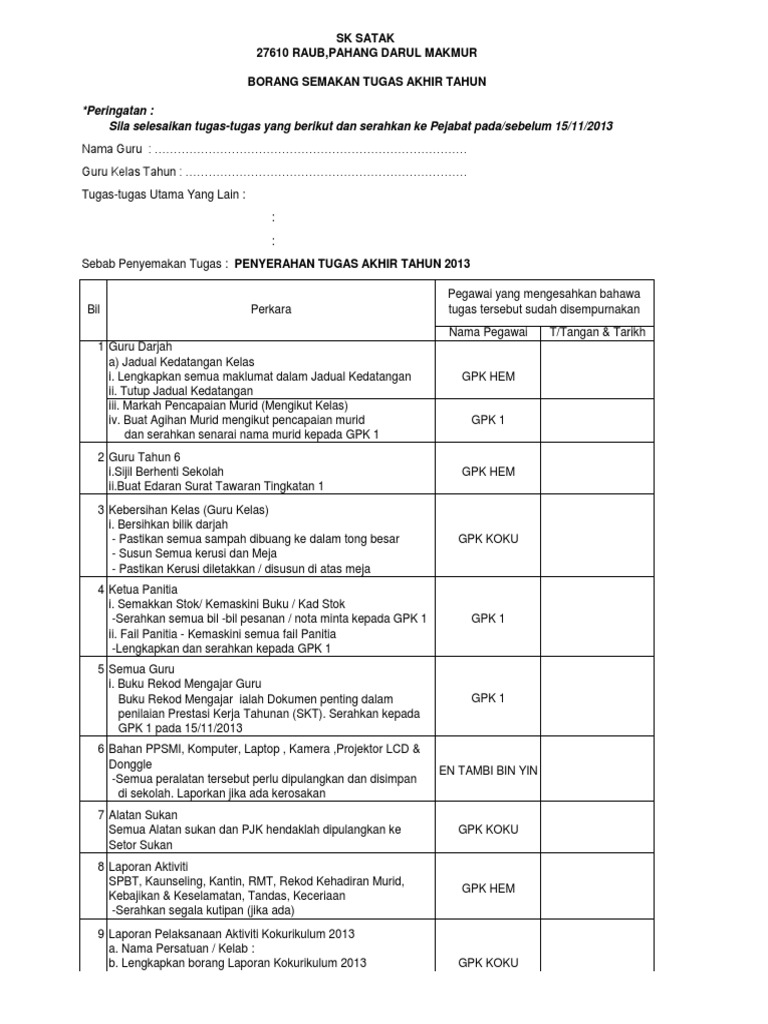 Mengundang asesor ban pt untuk memberikan pelatihan tentang cara pengisian borang dan evaluasi diri jurusan program studi f. Muhammad saiful amree guru berkenaan 06 11 2012 21 guru guru yang dijangka bertukar sila isikan borang serah tugas dalam 2 salinan borang boleh didapati di pejabat serahkan kunci laci meja kepada pengerusi kelab guru penolong kanan guru berkenaan pengerusi kelab guru pk t k 05 09 11 2012 22 barang barang buku buku guru di. The collection that comprising chosen picture and the best among others. Senarai semak tugas guru akhir tahun.