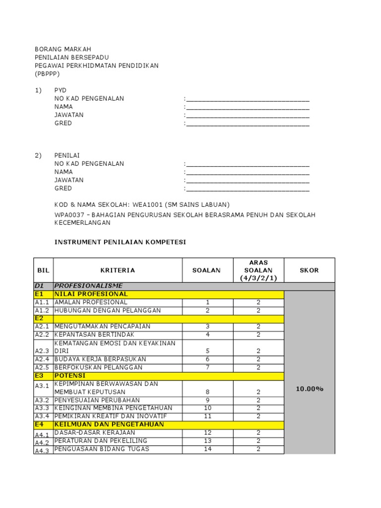 Borang skor penilaian bersepadu pbppp. Jawatankuasa pbppp jk pbppp instrumen rubrik skor penilaian bersepadu peg. Menilai keberhasilan aspek peningkatan dan pencapaian yang merupakan hasil kerja ppp. Jikalau anda penjawat awam jangan lupa untuk update sistem hrmis. Mengenalpasti kompetensi dan potensi ppp untuk membolehkan program pembangunan profesional berterusan cpd.
