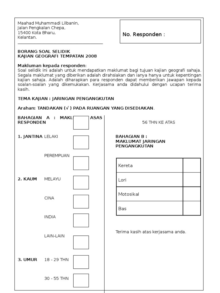 Related posts to contoh borang soal selidik pengangkutan awam contoh borang soal selidik pengangkutan awam 2017 02 26t16 32 00 08 00 rating. Pdf contoh folio geografi tingkatan 3 pengangkutan awam. Berikut adalah panduan gambaran di antara format borang kaji selidik bagi kerja kursus geografi pt3 tahun 2016 serta contoh perkara perkara yang perlu ada dalam borang soal selidik tersebut mysumber menjadikan jenis pengangkutan awam sebagai contoh bagi setiap perkara yang perlu ada dalam borang soal selidik. Contoh borang soal selidik temubual.