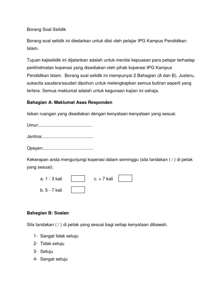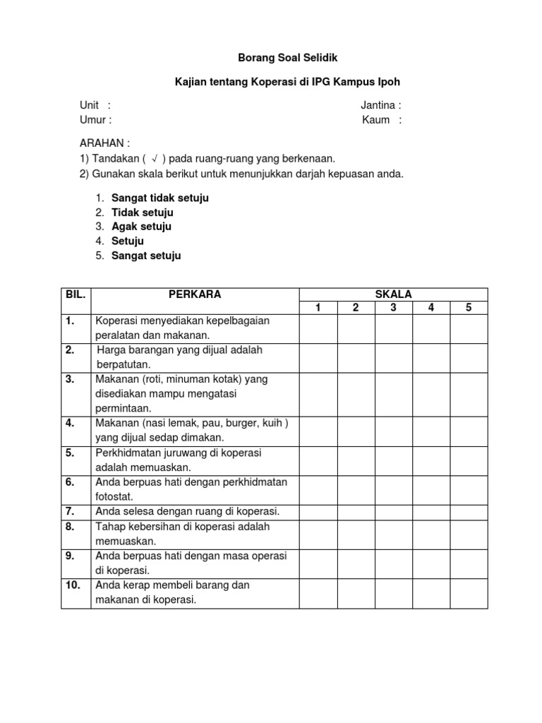 Dan koperasi kemudahan tempat letak kenderaan keselamatan kampus penginapan dan item yang terakhir adalah pengangkutan. Setiap koperasi dibekalkan sebanyak enam 6 salinan borang soal selidik untuk diisi. Contoh borang soal selidik okuma contoh borang soal selidik okulistik contoh borang soal selidik okun s law contoh borang soal selidik sejarah contoh borang soal selidik pembelajaran contoh borang soal selidik skala likert contoh borang soal kaji selidik contoh borang soal selidik kajian contoh borang soal selidik pengajian am contoh borang soal selidik pekerjaan contoh borang soal. Suruhanjaya koperasi malaysia skm adalah satu entiti yang telah diperbadankan pada 1 januari 2008.