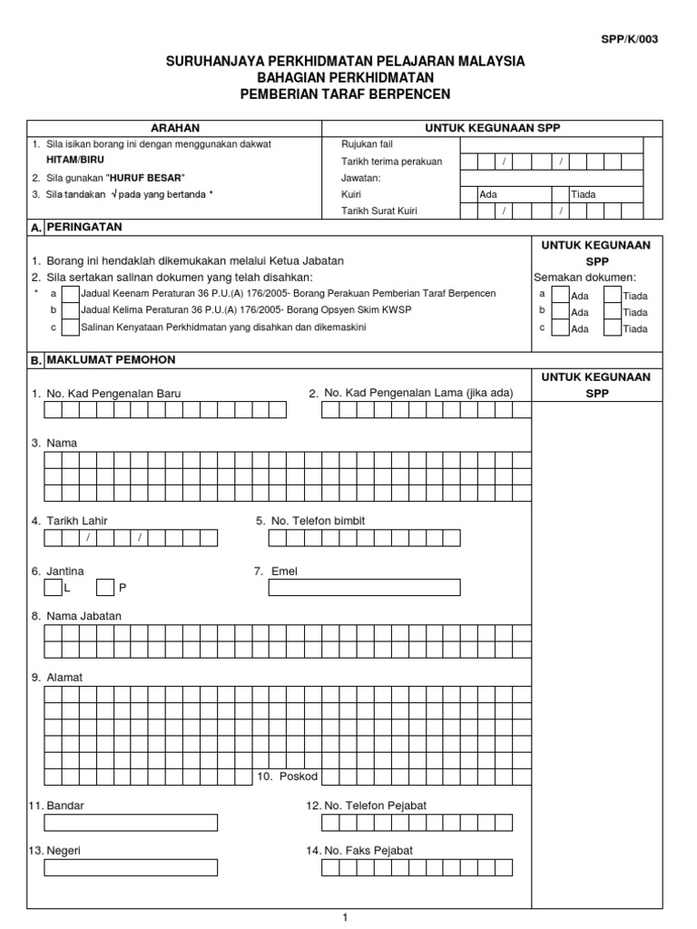 Borang spp k 002 pengesahan dalam perkhidmatan. Borang spp k 002 seperti di lampiran i. Jadual keiima peraturan 37 p u a 1 2012 borang opsyen kwsp. Pengesahan dalam perkhidmatan dilaksanakan berdasarkan peraturan 29 peraturan peraturan pegawai awam pelantikan kenaikan pangkat dan penamatan perkhidmatan 2012 p u. Bagi membolehkan seseorang pegawai disahkan dalam perkhidmatan pegawai perlu memenuhi semua syarat yang dinyatakan dalam skim perkhidmatan atau apa apa syarat.