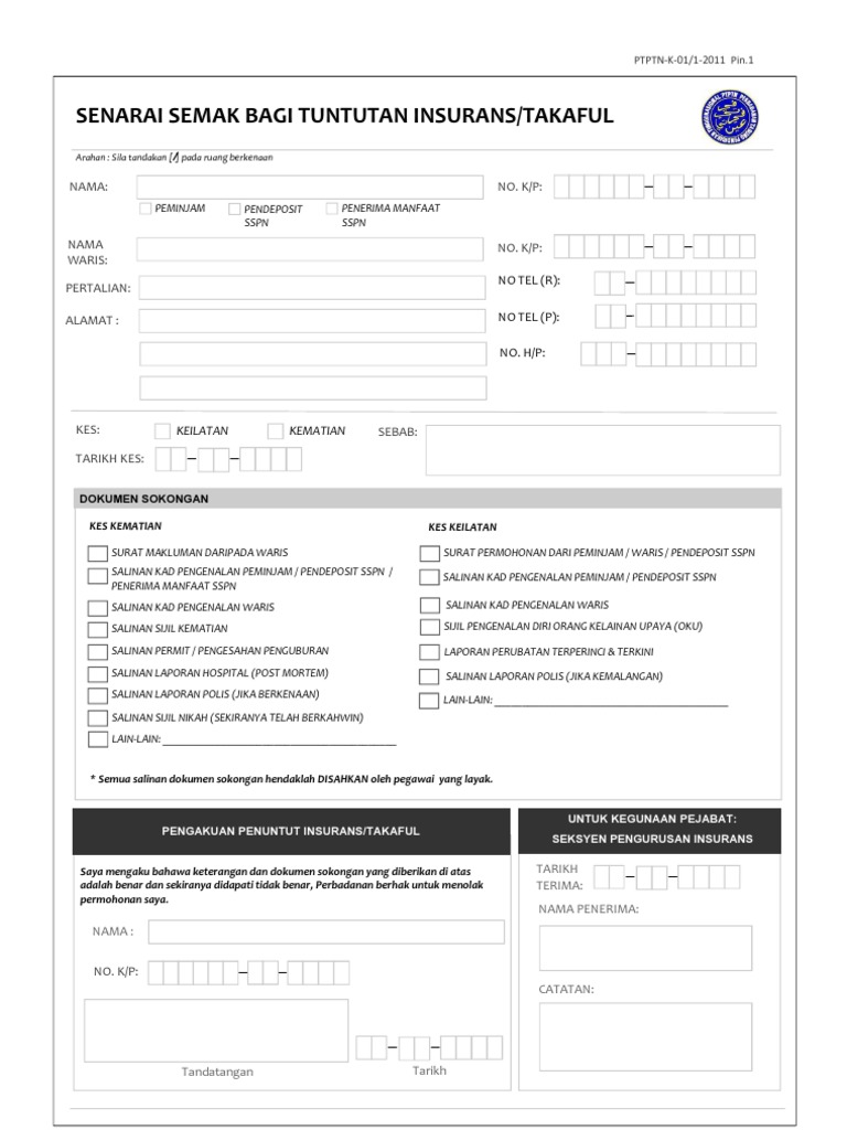 Perbadanan tabung pendidikan tinggi nasional ptptn tingkat bawah menara ptptn blok d megan avenue ii no. 03 2193 3000 faks. Muat turun dan lengkapkan borang permohonan tuntutan takaful. Borang tambahan seperti dijadual bawah perlu dilengkapkan bagi tuntutan berikut.