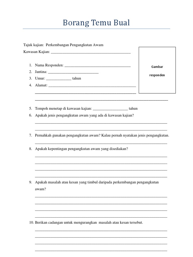 Borang temu bual pengangkutan. Tiga borang temu bual asal yang kamu isi 2 2 satu borang analisis maklumat temu bual 2 3 satu borang senarai orang sumber. Sila rujuk dengan guru terlibat bagi mendapatkan jumlah responden yang perlu di soal selidik atau temu bual. Bahan yang dikumpul daripada kaedah pemerhatian. Pelajar tingkatan 3 tahun 2018 perlu menyiapkan kerja kursus geografi jenis pentaksiran pelbagai instrumen yang berkaitan guna tanah di kawasan tempat tinggal sekolah calon.