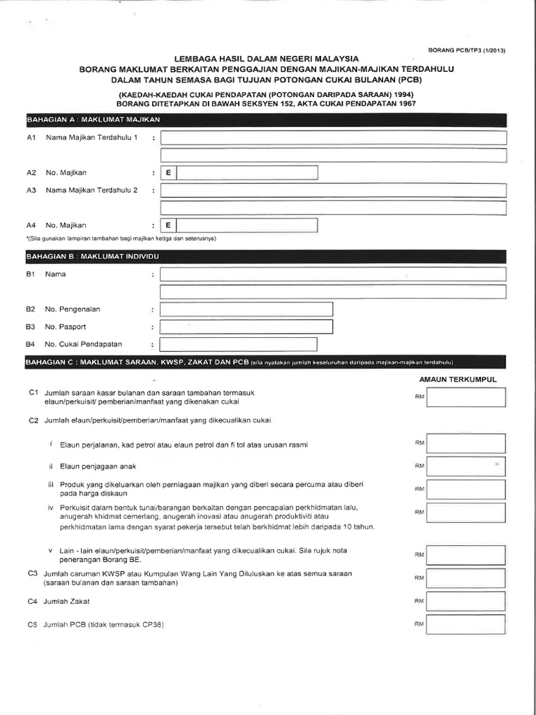 The form he asked me to fill up is called as borang pcb tp3 1 2013 i thought this form is between me and income tax depart. Ii tp3 form deletion of item d6 d7 and d9. Employee or salary number. Maklumat majikan a1 nama majikan terdahulu 1.