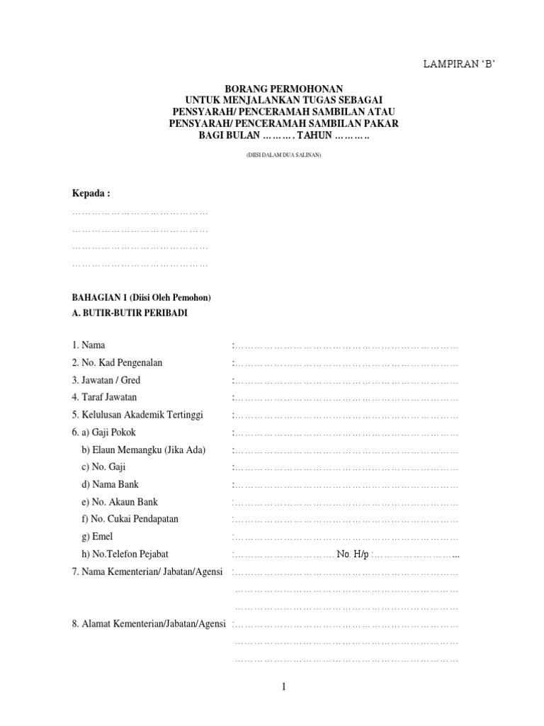 Jumlah besar tuntutan bulanan di para 1. Borang permohonan untuk menjalankan tugas sebagai pensyarah penceramah sambilan atau. 1pp pk 2 2013. Jumlah besar tuntutan bulanan di para 1 di atas adalah selaras dengan kelayakan saya seperti ditetapkan di perenggan 4 1 2.
