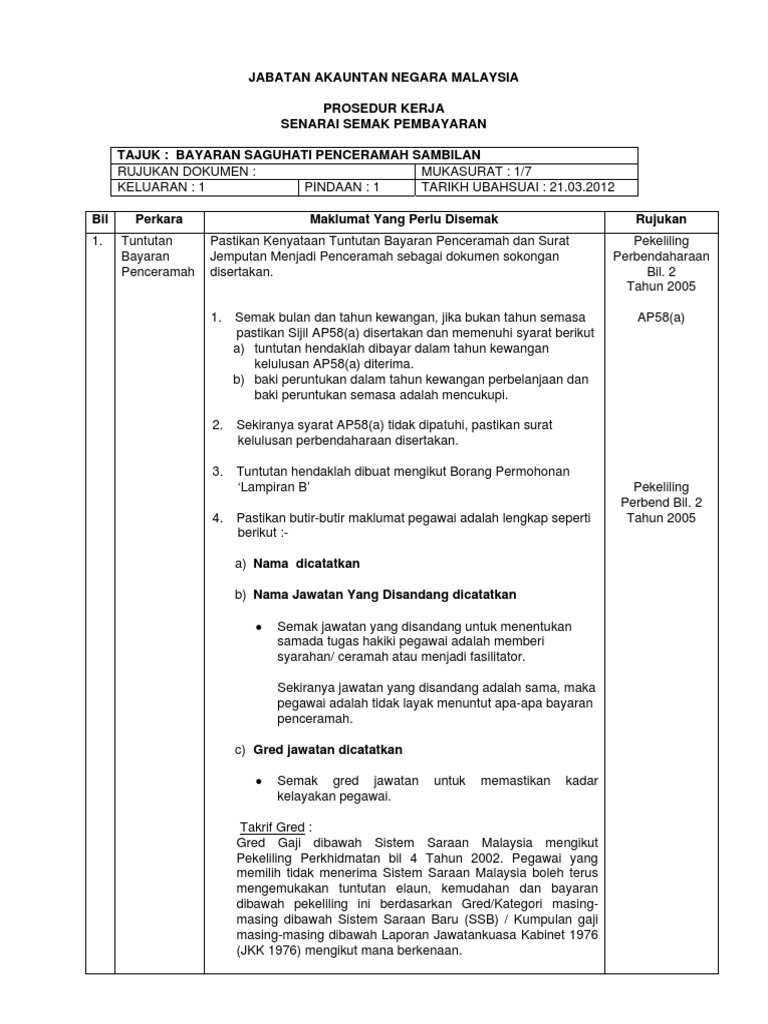 Terima tuntutan daripada pegawai seperti di lampiran pastikan borang permohonan dan dokumen sokongan lengkap berdasarkan senarai semak di lampiran f. Tuntutan bayaran penceramah tarikh ubahsuai. Borang tuntutan pensyarah penceramah dan fasilitator sambilan penceramah luar yang telah lengkap diisi dan ditandatangani oleh pemohon ketua jabatan tempat bertugas dan ketua jabatan penganjur syarahan ceramah. Borang baucar berasingan sg 50 arai ian 1 rujukan pekeliling perbendaharaan bil.