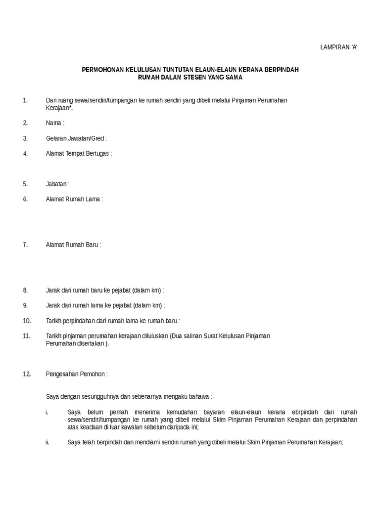 Borang tuntutan pindah rumah dalam stesen. Kenyataan tuntutan perpindahan rumah dari rumah sendiri rumah sewa rumah kerajaan ke rumah universiti dan sebaliknya mengikut kadar dalam stesen created date. Dan d dengan ini saya tidak akan membuat tuntutan yang sama. Berpindah rumah borang tuntutan elaun perpindahan rumah lampiran a surat pengesahan alamat rumah yang dibeli di bawah skim pinjaman perumahan kerajaan lampiran b borang akuan keluar kuarters lampiran c surat kelulusan pinjaman perumahan perbendaharaan surat pengesahan daripada pemohon yang menyatakan berulang alik dari rumah. 4 2 2 tuntutan tertakluk kepada syarat bahawa pegawai mendiami rumah tersebut.