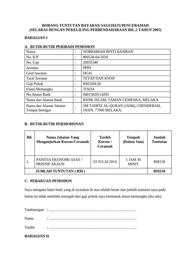 19 tahun 2002 diploma sijil sarjana muda sarjana ph d rm100 00 jam rm200 00 jam rm300 00 jam rm400 00 jam had maksimum sebulan tidak melebihi 1 2 daripada gaji bulanan pegawai. Surat pekeliling perbendaharaan bil. Nombor gaji wajib diisikan. Tuntutan bayaran saguhati sebagai pensyarah penceramah.