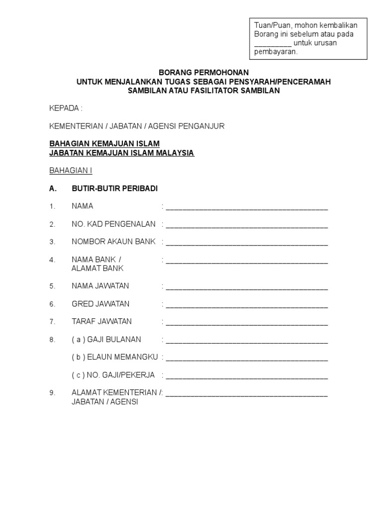 Borang tuntutan saguhati penceramah. Pembayaran tuntutan tidak akan diterima oleh pejabat pembayaran sekiranya butiran di atas tidak diisikan sepenuhnya. Borang ini hendaklah diisi dengan lengkap dan sempurna. Borang yang tidak lengkap akan dikembalikan. Pemprosesan bayaran permohonan pelbagai tuntutan saguhati kepada penceramah hendaklah dibuat.