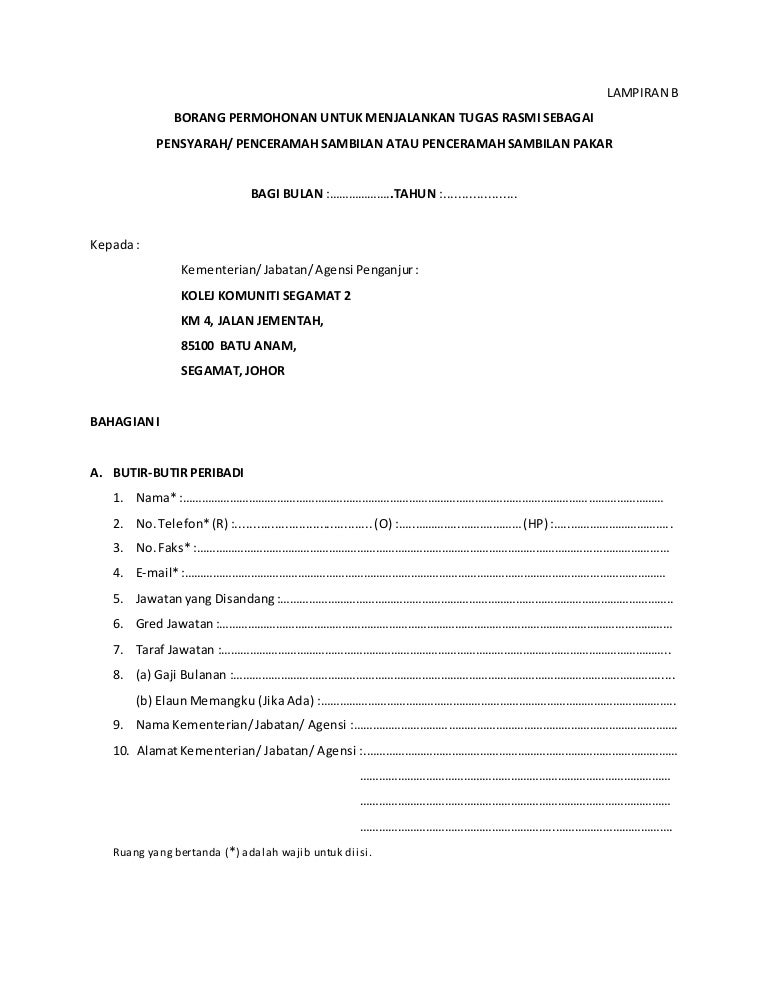 Yong chee kong last modified by. Borang tuntutan penceramah lampiran b di wp 1 8 surat jemputan sebagai penceramah. Nombor gaji wajib diisikan. Borang permohonan untuk menjalankan tugas sebagai pensyarah penceramah sambilan atau.