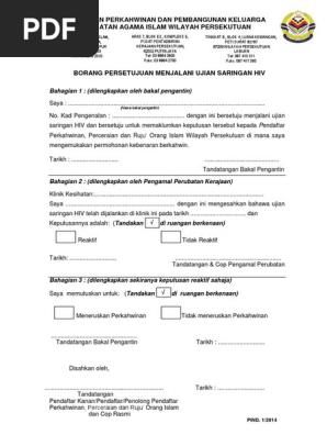 Jadi awak kena download guna borang ujian hiv yang dikeluarkan oleh jabatan. Borang pengesahan tempat tinggal. Jumlah bayaran yang dikenakan untuk menjalani ujian hiv pemohon boleh mendapatkan borang ujian hiv yang berharga rm 10 00 di bahagian perundangan keluarga jais atau di mana mana pejabat agama islam daerah di negeri selangor. Borang persetujuan menjalani ujian saringan hiv kompleks pusat islam jalan perdana pusat tel.