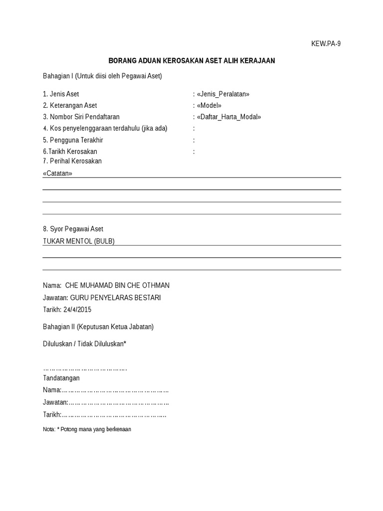 Dapatkan borang aduan kerosakan aset alih kerajaan kew pa 9 inventori cara ini dilakukan jika aset yang hendak dilupuskan tidak mempunyai rekod penyelenggaraan sepanjang usia penyimpanannya. Pc printer server 3. Kew pa 9. Kos penyelenggaraan terdahulu jika ada.