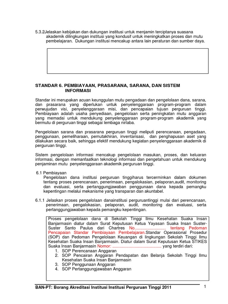 Peraturan menteri riset teknologi dan pendidikan tinggi nomor 44 tahun 2015 tentang standar nasional pendidikan tinggi. Ban pt melakukan validasi hasil ak dan al serta mengeluarkan keputusan hasil akreditasi 6. Tata pamong dan kerjasama 3. Pembiayaan prasarana sarana dan sistem informasi borang akreditasi institusi upn veteran yogyakarta tahun 2013 334 334 5 anggaran cadangan yaitu anggaran yang dicadangkan untuk pengeluaran yang akan ditentukan kemudian atas ijin kepala bp dik.