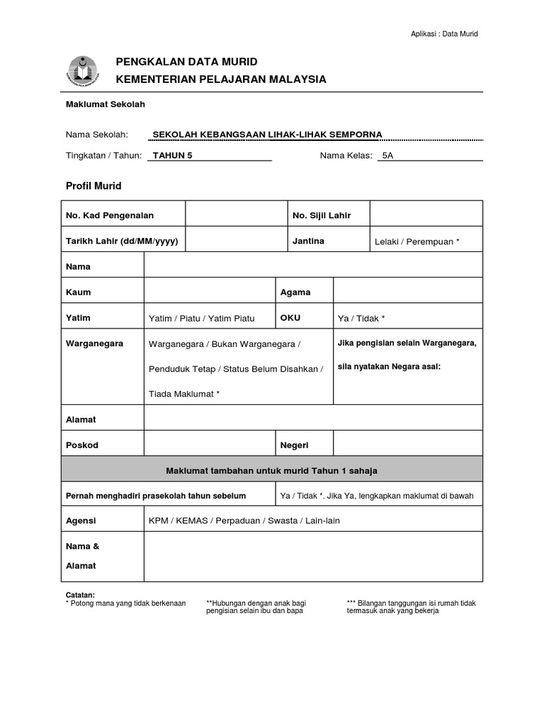 Contoh borang apdm. Mohd mustakim kamarudin pengarang at kpm. Berikut merupakan borang maklumat murid yang telah dihasilkan berdasarkan aplikasi pangkalan data murid. Follow published on jan 23 2013. Guru guru boleh muat turun borang aplikasi pangkalan data murid ini dalam format m word senang edit ataupun dalam format pdf format m word doc.