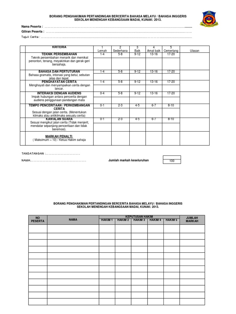 Keputusan hakim pertandingan cerita bahasa melayu sekolah rendah peringkat kebangsaan bahagian. Bil nama teknik persembahan 20 m bahasa dan pertuturan 20 m penghayatan cerita 20 m interaksi 15 m mesej. Sk simpang tiga padang hang borang pemarkahan pidatopembahagian markah pidatoidea isi 30 markah peserta pidato akan diadili dari segi pengutaraan tiga idea isi. Berkeyakinan da at mem engaruhi dan menarik erhatian audiens 1 markah borang r m san hakim disi eh sem a hakim pertandingan pidato pia a dira a peringkat seko ah daerah bahagian.