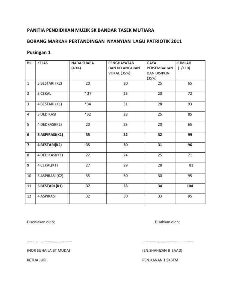 Suara nada pic 10 40 markah dinamik 10 pernafasan 10. Borang pemarkahan pertandingan battle of the band 2015 smk mat salleh. Jabatan masing masing borang yang difotokopi juga diterima. Pertandingan akan berlangsung selama satu hari pada hari tarikh yang telah ditetapkan mulai jam 08 30 pagi.